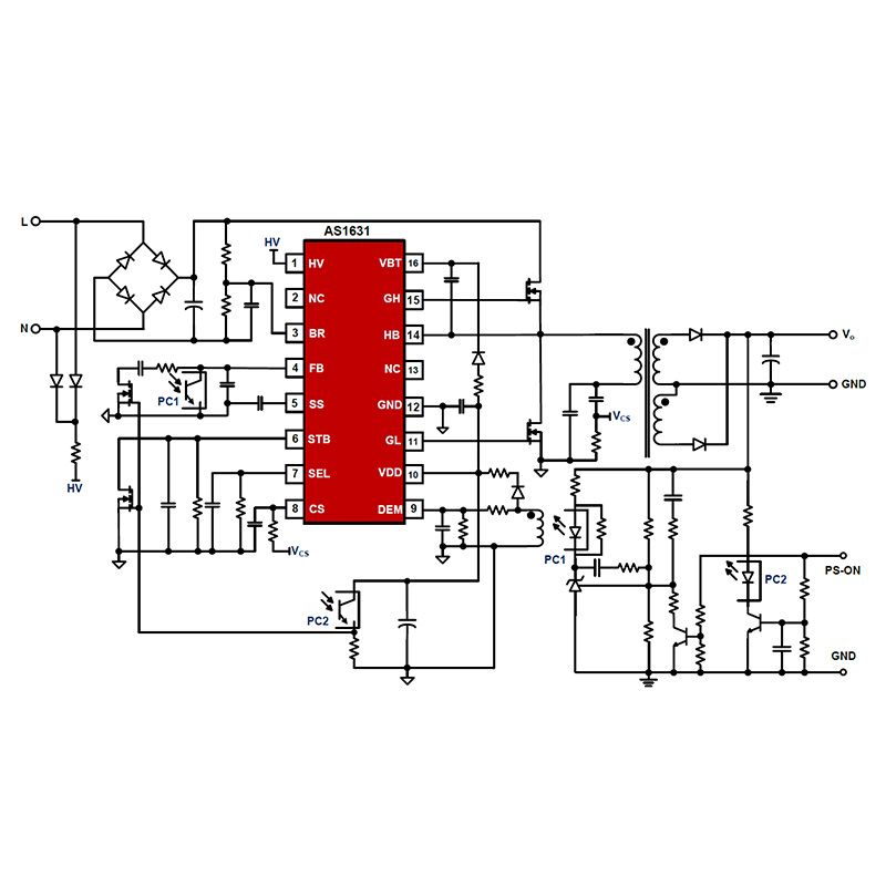 Ang AS1631 ay isang resonant switching power controller batay sa isang half-bridge LLC resonant converter. Pinagsasama ng chip ang high-voltage start, AC power failure detection at X capacitor discharge functions upang matugunan ang mga kinakailangan ng mabilis na pagsisimula at ultra-low standby.