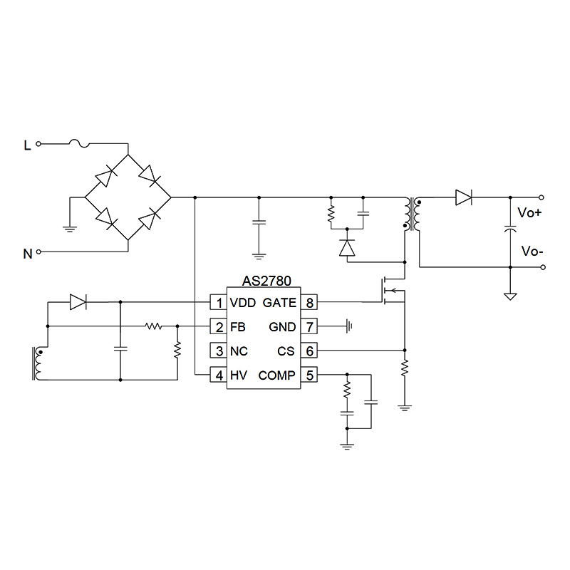 Ang AS2780 ay gumagamit ng quasi-resonant working mode, ang sistema ay may mataas na kahusayan sa pagtatrabaho, ngunit maaari ring makakuha ng mas mahusay na pagganap ng EMC. Maaaring itakda ng chip ang pinakamababang operating frequency, na maaaring matiyak na ang output boltahe ng system ay hindi naaanod sa ilalim ng magaan na pseudo load na mga kondisyon, at nakakatugon sa mga kinakailangan ng mababang standby loss.
