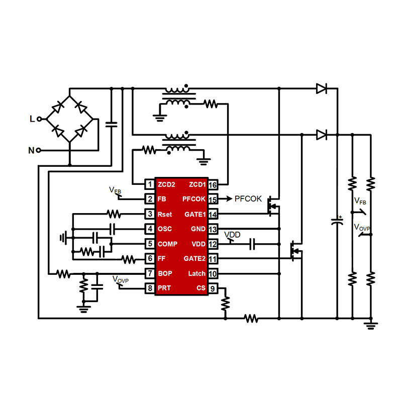 Ang AS6A31N ay isang two-phase Interleaved, critical on-mode Boost (CRM Boost) constant voltage power factor correction (PFC) controller.