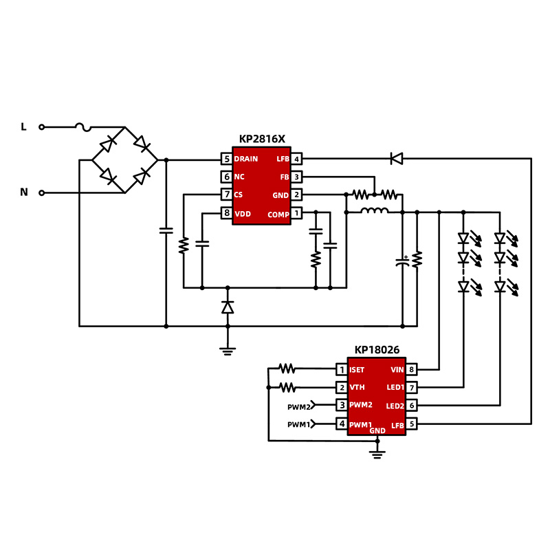 Ang KP28123SGA ay isang single-stage high PFC non isolated constant voltage BUCK power chip. Ang chip ay gumagamit ng isang quasi resonant operating mode at adaptive na inaayos ang output boltahe, na hindi lamang nakakatugon sa mga kinakailangan ng boltahe ng susunod na yugto ng linear constant current, ngunit nagpapabuti din ng kahusayan ng system.