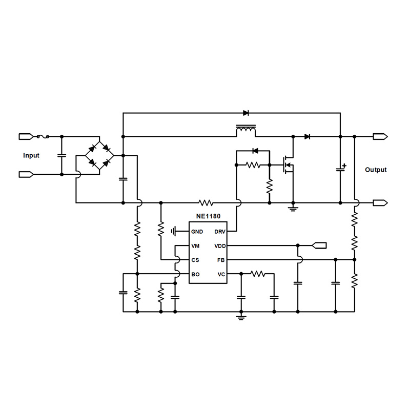 Ang NE1180 ay isang controller para sa tuluy-tuloy na on-mode (CCM) power factor correction (PFC) step-up preconverters. Sa fixed frequency mode, kinokontrol nito ang power switch on-time (PWM) at depende sa instant coil current. Ang circuit ay nakabalot sa SO-8, pinaliit ang bilang ng mga panlabas na bahagi at lubos na pinapasimple ang pagpapatupad ng PFC. Isinasama rin nito ang mataas na mga tampok sa kaligtasan para sa epektibong input power runaway clamp circuits